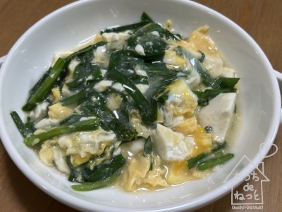 朝の忙しいときにニラ玉豆腐丼にするとスルスル食べれるし楽ちん♪